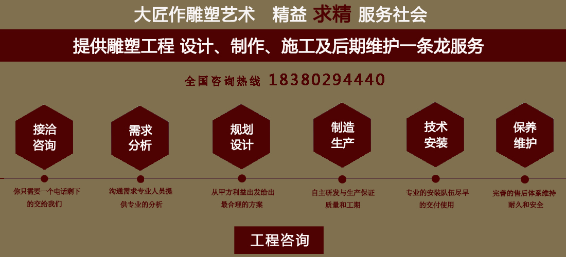 成都大匠作雕塑有限公司,是經(jīng)成都工商局審定注冊的正規(guī)專業(yè)雕塑制作及工程安裝服務機構(gòu),是由一群年輕富有朝氣的年輕人創(chuàng)辦,發(fā)軔于四川省成都市龍泉驛區(qū)。它是一家******于創(chuàng)作、制作和銷售為一體的公司。大匠作擁有多年從事公共藝術(shù)的專業(yè)人員和雕塑制作人組成的核心團隊,為您提供專業(yè)、具創(chuàng)新的設計及制作服務。公司成立以來,秉承“******服務、誠信為本”的宗旨,以客戶需求為目標導向,不斷學習,進取,優(yōu)化和提高服務質(zhì)量,公司向您******——“您的滿意***是我們的信譽”,我們將以飽滿的熱情和******的服務贏得您的贊譽和支持。 愛心,細心,耐心,責任心是我們的要求,盡心盡職,為您打造出創(chuàng)新、專業(yè)、******的設計方案,我們堅信先做人、后做事,用心對待客戶,實行透明收費,人性化服務,本著對客戶負責,對客戶負責,更是對自己發(fā)展負責的態(tài)度,爭取做到讓每位客戶滿意